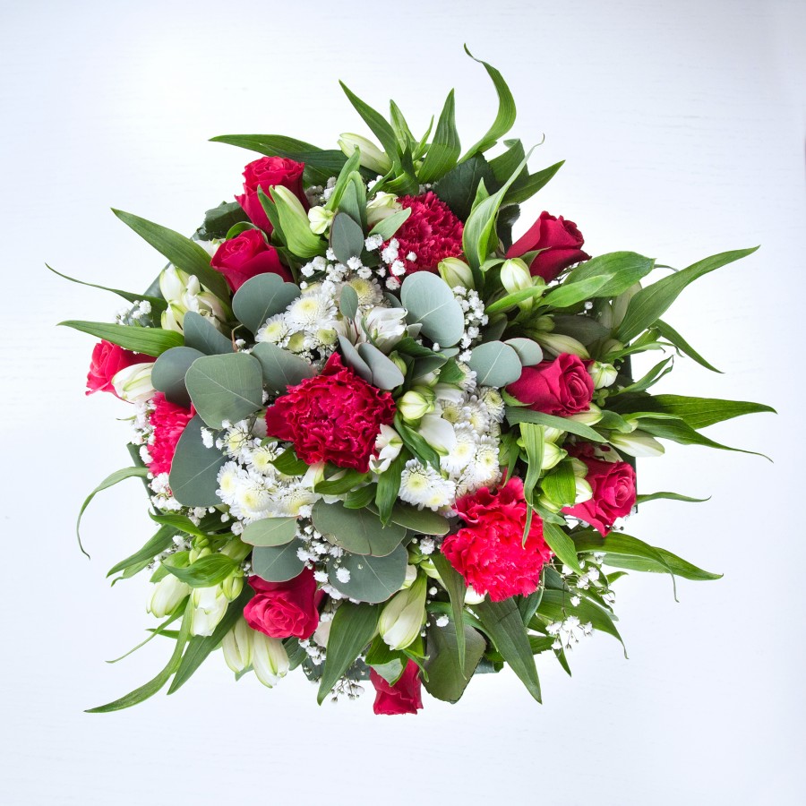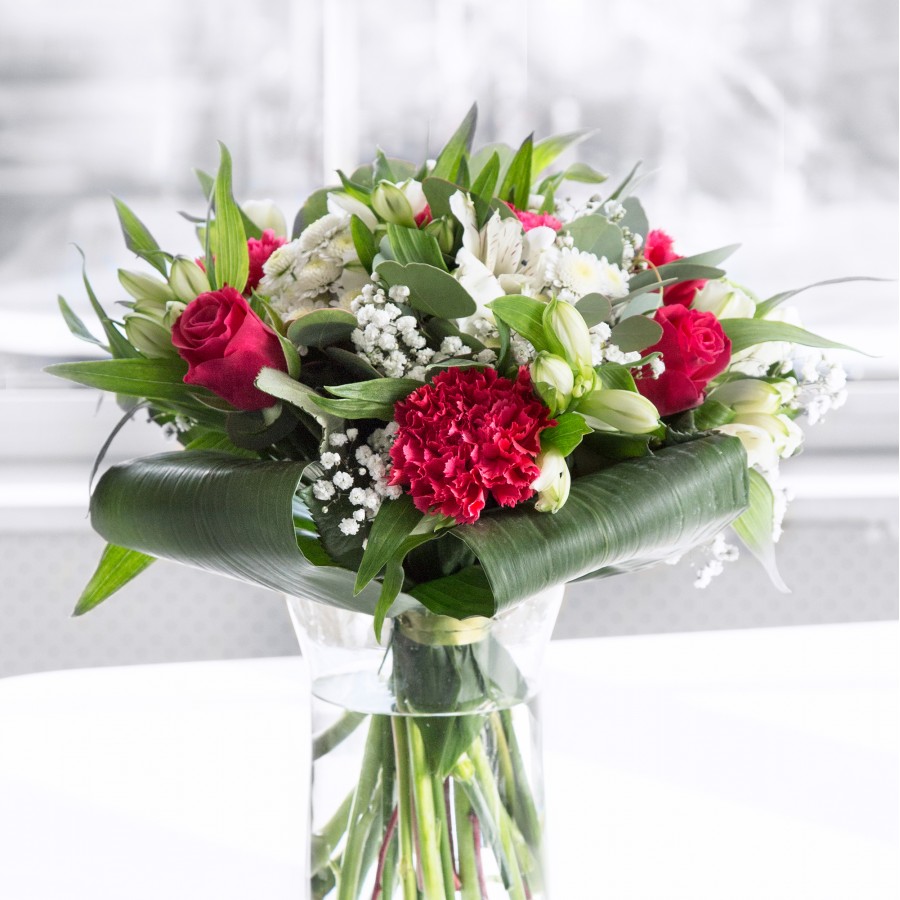 Embrace sophisticated elegance with our stunning flower arrangement. This bouquet features deep red roses and pristine white chrysanthemums, harmoniously blended with delicate gypsophila and vibrant carnations. Enhanced by white alstroemeria and lush aspidistra leaves, the design is both unique and enchanting.