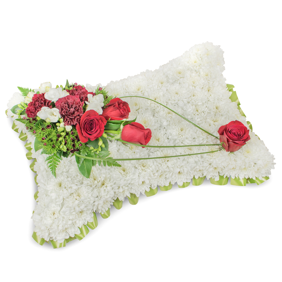 Handmade by our expert florists in West Hampstead, each sympathy cushion is arranged with care to ensure perfect balance, texture and colour. The white blooms symbolise peace and remembrance, while the red accents express love and heartfelt respect. Its approximate dimensions of 45cm x 60cm x 12cm (18" x 24" x 5") make it an ideal size for display alongside the casket or at a remembrance service.